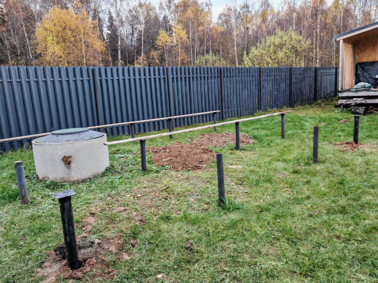 После завинчивания, верхние части свай были выровнены по единому уровню, заполнены цементно-песчаным раствором для защиты от коррозии изнутри и увеличения несущей способности, а затем на них были приварены оголовки, которые служат опорной площадкой для будущей конструкции. Весь процесс монтажа был выполнен максимально чисто и аккуратно, без нанесения ущерба ландшафту дачного участка.